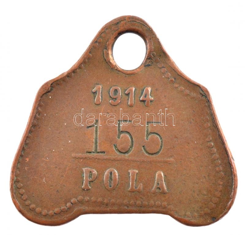 1914. "Pola 1914" kétoldalas bronz kutyabárca "155" számmal. Pola (ma Pula) horvátországi város a tengerparton. T:2
