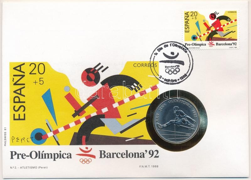 Kongói Demokratikus Köztársaság 1991. 100Fr acél "XXV. Nyári Olimpia 1992. Barcelona - Gátfutás" forgalomba nem került emlékkiadás felbélyegzett borítékban, bélyegzéssel, német nyelvű tájékoztatóval T:1