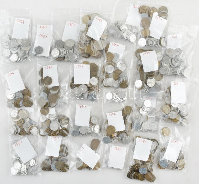 Description: 1951-1991. Több száz darabos forint-fillér gyűjtemény tétel, nagyobbrészt az 1970-1980-as évekből, ezek évjáratok szerint külön csomagolva, a korábbi évek egybe csomagolva T:vegyes