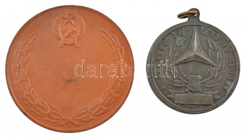 ~1950. "Honvéd Sportversenyek" bronzozott fém emlékérem, Rákosi-címerrel. Szign.:Jákfalvy (50mm) + "A dolgozó nép rendjét védjük" Br díjérem szalag nélkül, "Ludvig BP" gyártójellel (35mm) T:2 patina, kopott bronzozás, kis ph