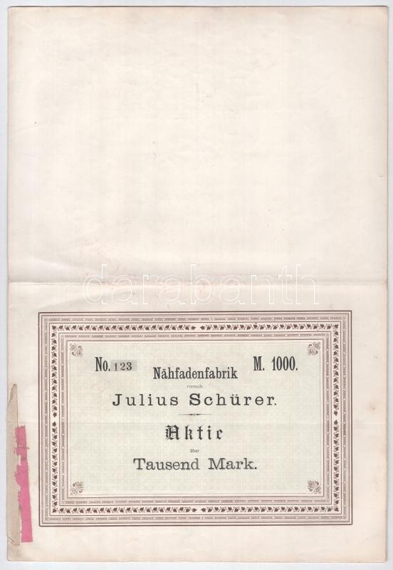 Német Birodalom / Augsburg 1887. "Varrócérnagyár (korábban Julius... https://www.darabanth.com/en/425-Online-auction/425.0/Numismatics/Shares-and-Tickets~1500005/Nemet-Birodalom-Augsburg-1887-Varrocernagyar-korabban-Julius-Schurer-reszvenye-1000M~II2712172