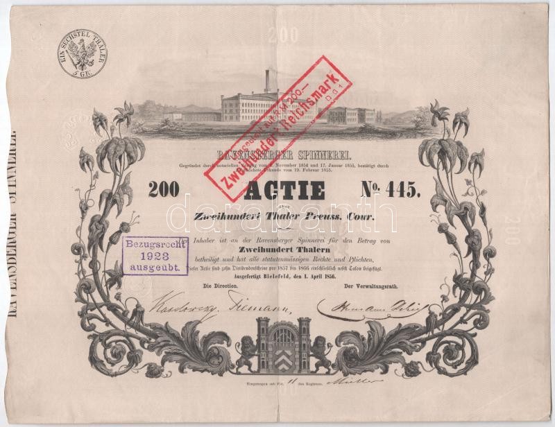 German Empire / Bielefeld 1856. "Ravensberger Spinnerei" share about 200 Thaler with embossed stamps and overprints C:F