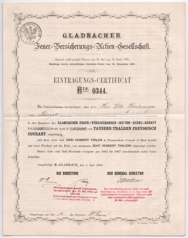 German Empire / Gladbach 1862. "Gladbacher Feuer-Versicherungs-Actien-Gesellschaft" entry certificate, filled out, with embossed stamp and overprints C:F spotted