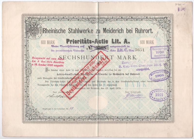 Description: Német Birodalom / Meiderich bei Ruhrort 1878. "Meiderich bei Ruhrort-i Rajnai Vasművek" elsőbbségi részvénye 600M-ról szárazpecstéttel, felülbélyegzésekkel T:III