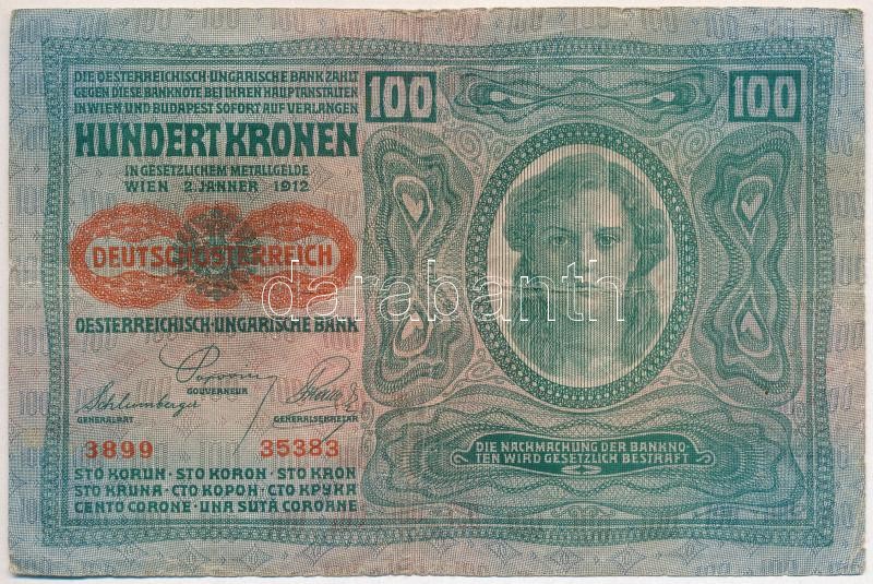 Austria 1919. (1912) 100 Kronen, with horizontal "DEUTSCHÖSTERREICH" overprint, both sides in german C:F,VG small tears