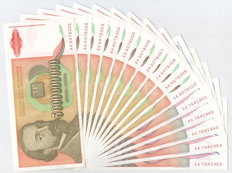 Jugoszlávia 1993. 5.000.000.000D (10x) "AA 6078301-6078310" sorszámkövetők + 50.000.000.000D (5x) "AA 7641961-7641965" sorszámkövetők T:I--III vízfolt