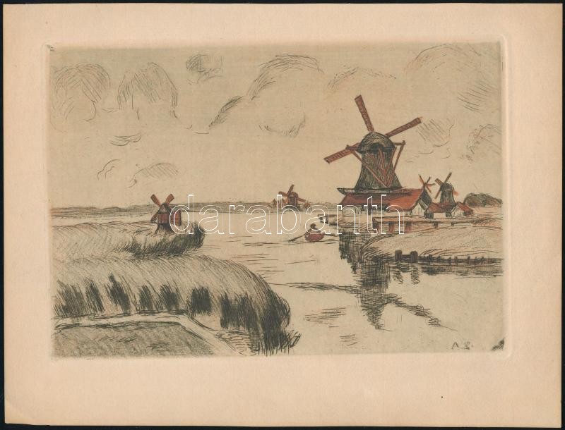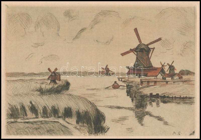 AS jelzéssel. Holland szélmalmok. Színezett rézkarc, papír, 13,5x19,5 ...