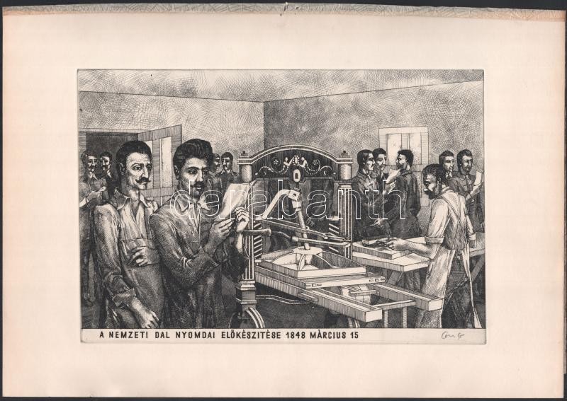 Gacs Gábor (1930-2019): A Nemzeti Dal nyomdai előkészítése 1848 március 15. Rézkarc, papír, jelzett, 19,5x29 cm