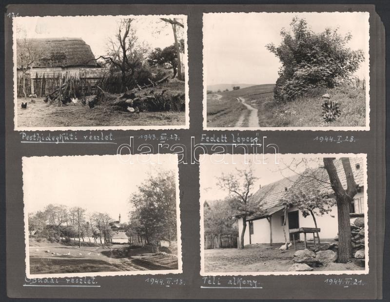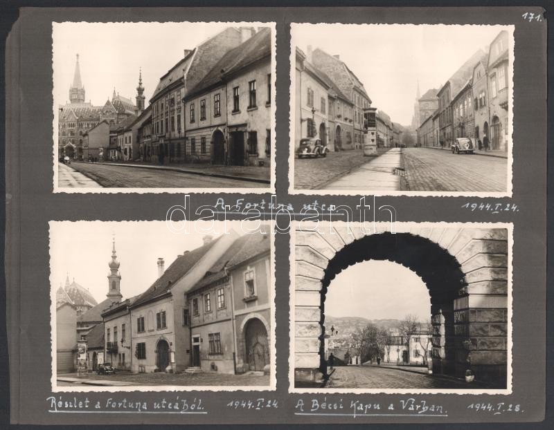 1943-1944 Budapest, Vár, Fortuna utca, Bécsi kapu, Pesthidegkút, stb., 8 db albumlapra ragasztott fotó, feliratozva, 9×11,5 cm