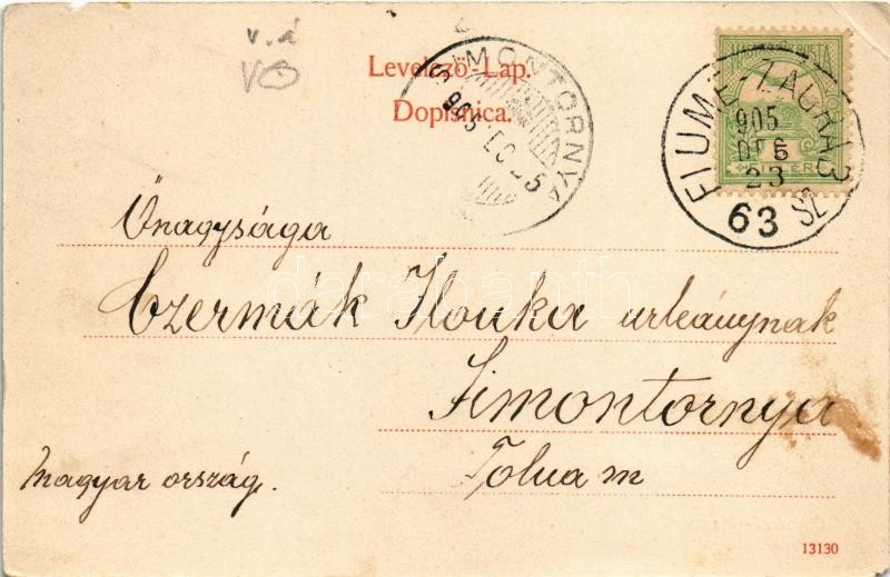 1905 Komorske-Moravice, Cameral-Moravica; vasútállomás, vonat / Bahnhof / railway station, train + "FIUME - ZÁGRÁB 63. SZ." vasúti mozgóposta bélyegző (EM)