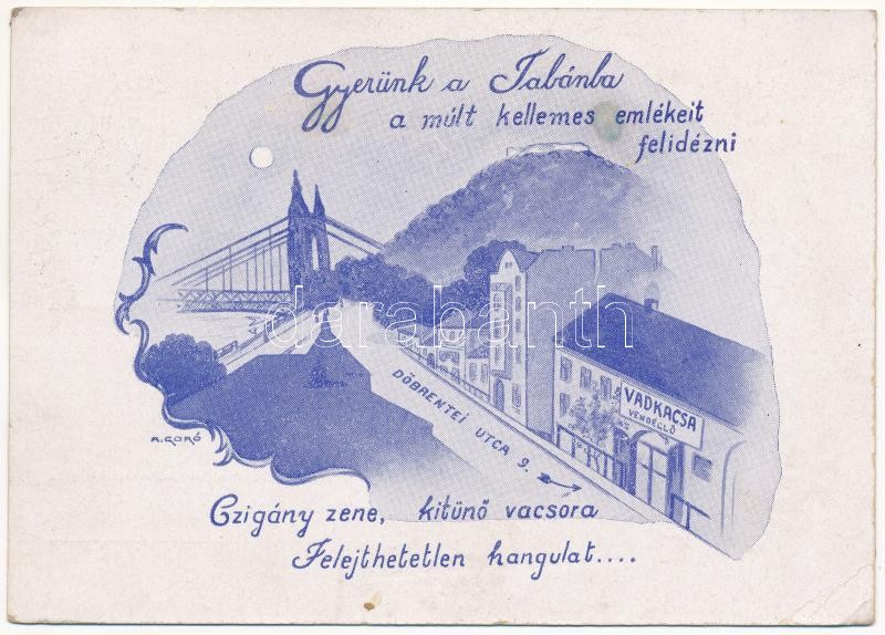 1944 Budapest I. Tabán, Vadkacsa vendéglő reklám: Gyerünk a Tabánba a ... https://www.darabanth.com/en/425-Online-auction/425.0/Postcards/Hungary~2000005/1944-Budapest-I-Taban-Vadkacsa-vendeglo-reklam-Gyerunk-a-Tabanba-a-mult-kellemes-emlekeit~II2702280