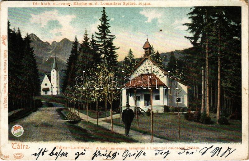 Description: 1903 Tátralomnic, Tatranská Lomnica (Magas-Tátra, Vysoké Tatry); Die kath. u. evang. Kirche m. d. Lomnitzer Spitze / Katolikus és evangélikus templom a Lomnici csúccsal. Feitzinger Ede 1902/12. 349. / churches, Lomnicky stít (EK)