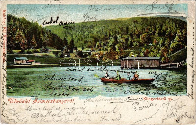 1907 Selmecbánya, Schemnitz, Banská Stiavnica; Klingertárói tó, csónakázók. Makónyi Pál kiadása / lake, rowing boat (r)