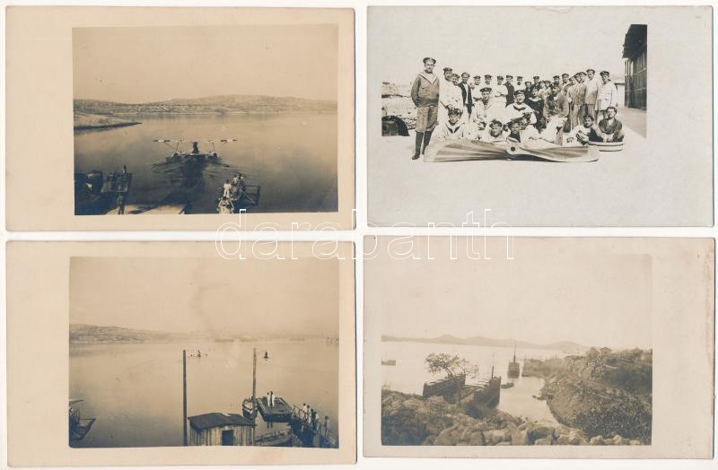 Description: 8 db eredeti fotó felvétel Osztrák-Magyar haditengerészet hidroplán állomásáról: hidroplán a vízen, légcsavaros csoportkép, hangár, temető, életképek / K.u.k. Kriegsmarine Wasserflugzeug Station, Seeflugzeug / 8 original photos of the Austro-Hungarian Navy seaplane station: hydroplanes, group photos... etc.