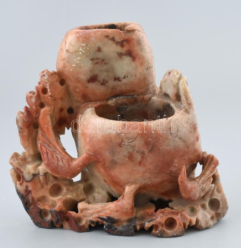 Kínai faragott zsírkő madaras váza / dísz, 13,5x12,5 cm