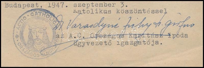 1947 Varasdy Sándorné, Zichy Henriette grófnő sk aláírása Actio Catholica levélen