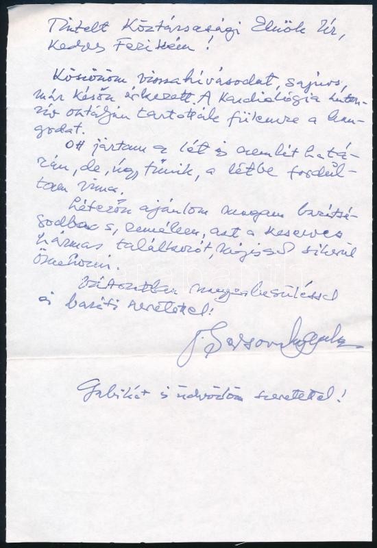 Description: cca 2000-2001 Obersovszky Gyula (1927-2001) újságíró, költő, 1956-os forradalmár, korábbi halálraítélt autográf levele Mádl Ferenc (1931-2011) köztársasági elnöknek, 1 beírt oldal és egy további levele ismeretlen államtitkárnak Attila megszólítással. + 1 db telefax címlap Mádl Ferenc köztársasági elnöknek, Obersovzskly Gyula által küldött faxhoz kapcsólódó, fax tartalma nem ismert.