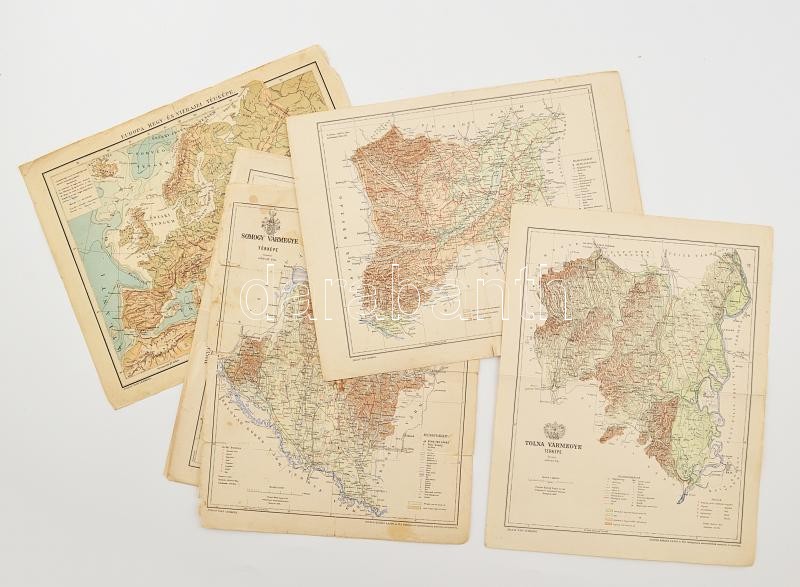 cca 1900 8 db vármegye és hegy- és vízrajzi térkép (Zala, Vas, Tolna, Somogy, Modrus-Fiume, Magyarország, Európa), szakadásokkal, 24×30 cm