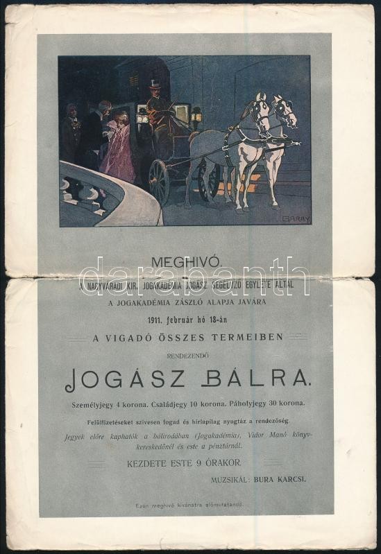 1911 Nagyvárad, a Jogakadémia meghívója jogász bálra, hajtott, szakadá...