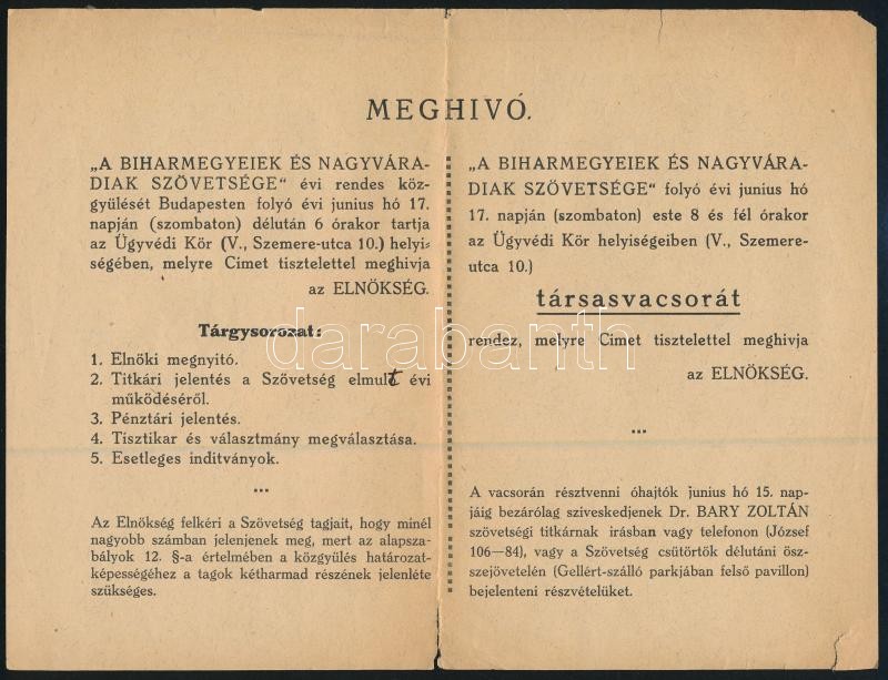 cca 1910 Biharmegyeiek és Nagyváradiak Szövetségének meghívója társasv...
