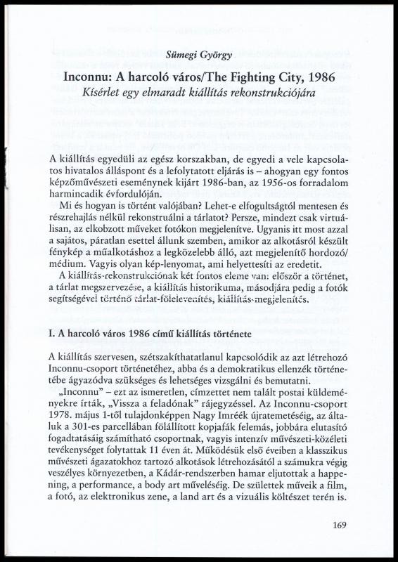 Sümegi György: Inconnu: A harcoló város/The Fighting City, 1986. KÃsérlet egy elmaradt kiállÃtás rekonstrukciójára. Bp., 2010., L'Harmattan. Fekete-fehér fotókkal illusztrált. Különlenyomat. Kiadói papÃrkötés.