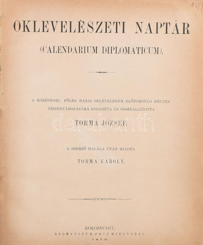 Torma József: Oklevelészeti naptár (Calendarium diplomaticum). A középkori, főleg hazai okleveleken előforduló keltek meghatározására dolgozta és összeállította - -. A szerző halála után kiadta Torma Károly. Kolozsvár, 1879., K. Papp Miklós, 2+30+LXVI p.+2 (kihajtható mellékletek) t. Átkötött kopott félvászon-kötés, régi intézményi bélyegzéssel.