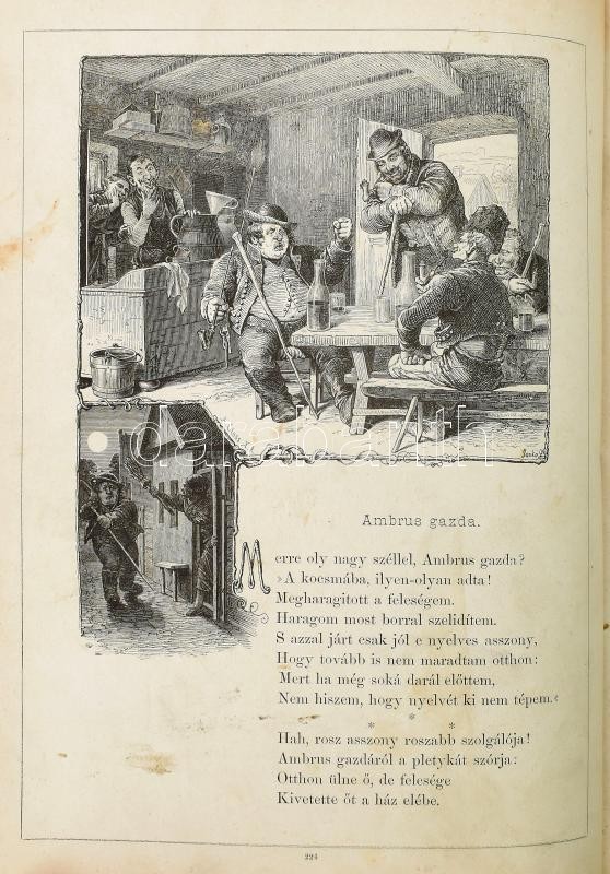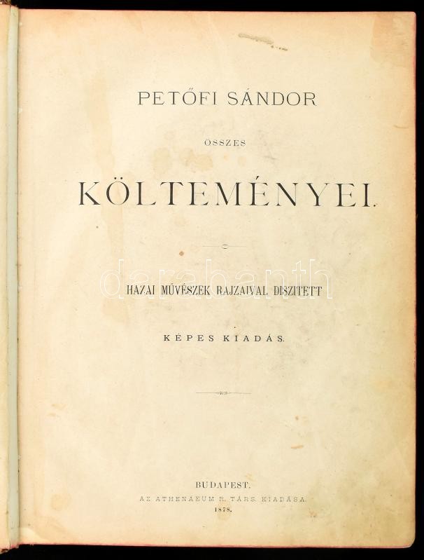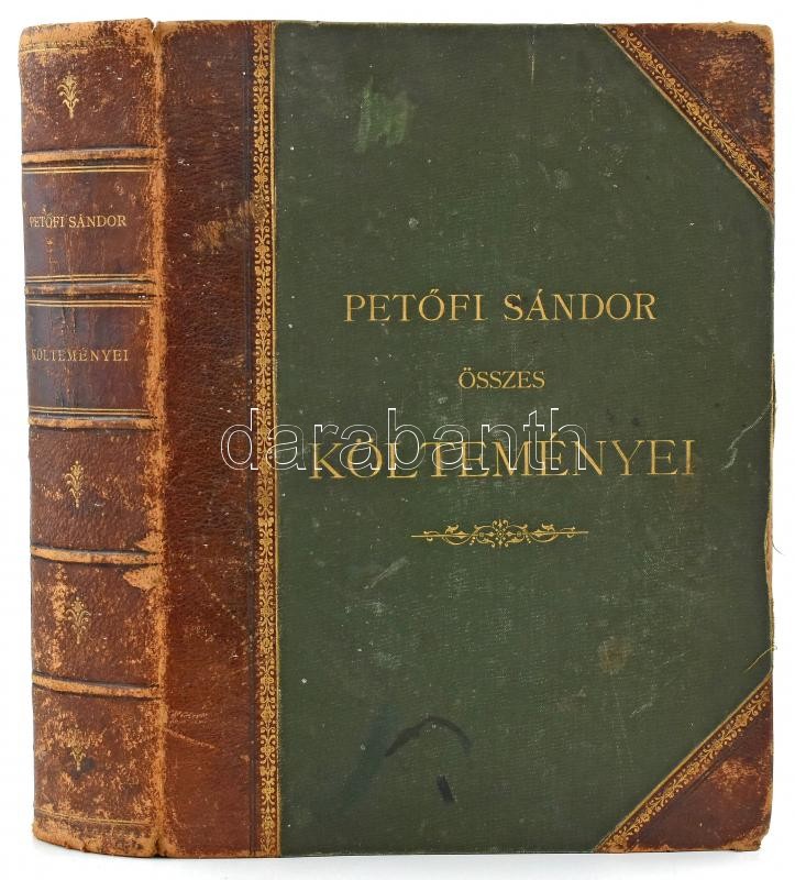 Petőfi Sándor összes költeményei. Hazai művészek rajzaival díszített képes kiadás. Bp., 1878, Athenaeum, 805+(10) p. Rengeteg szövegközi fametszetű illusztrációval, könyvdíszekkel, a metszetek közt Pollák Zsigmond, Morelli Gusztáv és mások munkáival. Kiadói bordázott gerincű, aranyozott félbőr-kötés, kopott, kissé sérült borítóval és gerinccel, helyenként foltos lapokkal, néhány lapon lapszéli szakadással.
