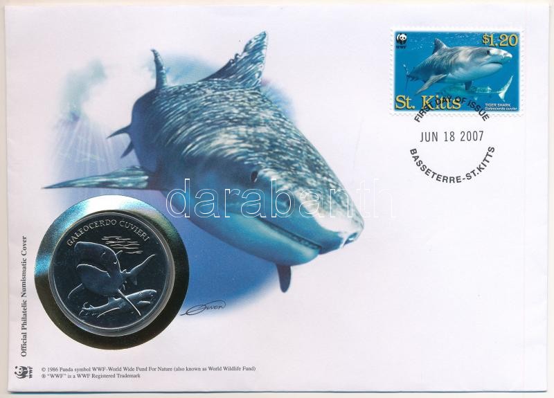 Kelet-Karibi Államok / St. Kitts DN (1991) "A Világ Vadvédelmi Alap (WWF) 30. évfordulója - Galeocerdo Cuvieri (Tigriscápa)" kétoldalas Cu-Ni emlékérem érmés borítékban, bélyeggel és bélyegzéssel, német nyelvű ismertetővel T:PP kis patina