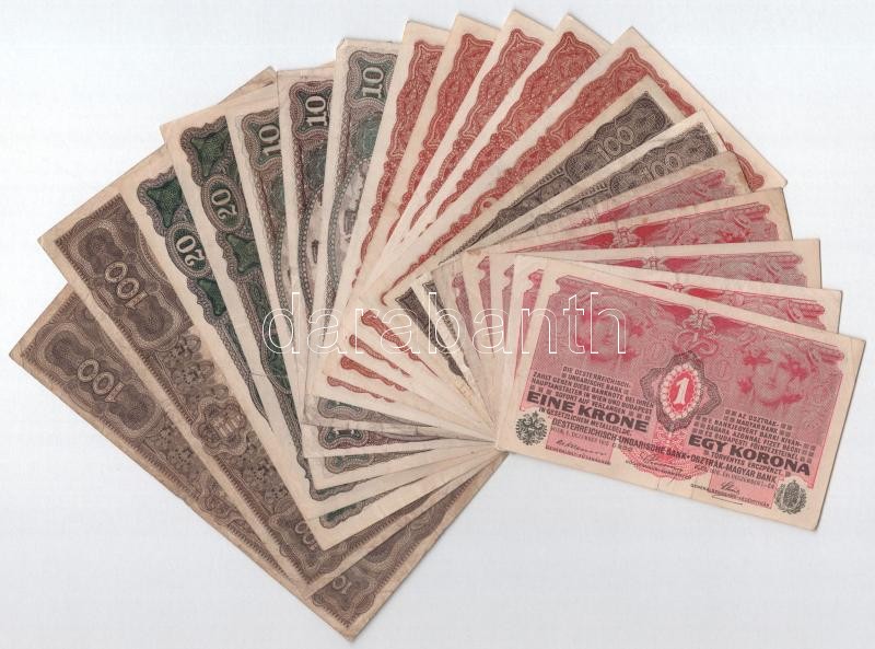 19db vegyes korona bankjegy tétel, közte 1920. 100K "Orell Füssli...