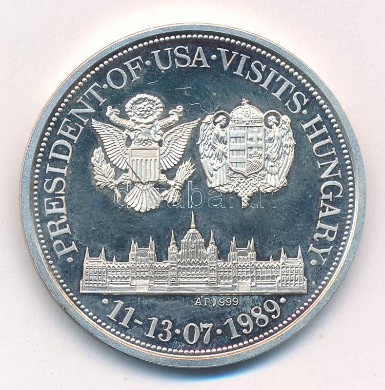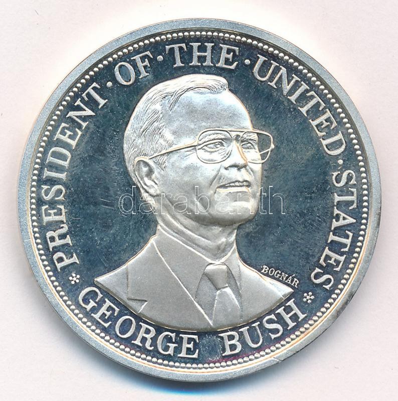 Bognár György (1944-) 1989. "Az Amerikai Egyesült Államok elnöke George Bush / Az USA elnökének magyarországi látogatása 1989. július 11-13" Ag emlékérem sérült eredeti tokban (31,34g/0.999/42,5mm) T:1- (PP) ujjlenyomatos Hungary 1989. "President of the United States George Bush / President of USA visits Hungary 11-13. 07. 1989" Ag commemorative medallion in damaged original case. Sign.: György Bognár (31,34g/0.999/42,5mm) C:AU (PP) fingerprints
