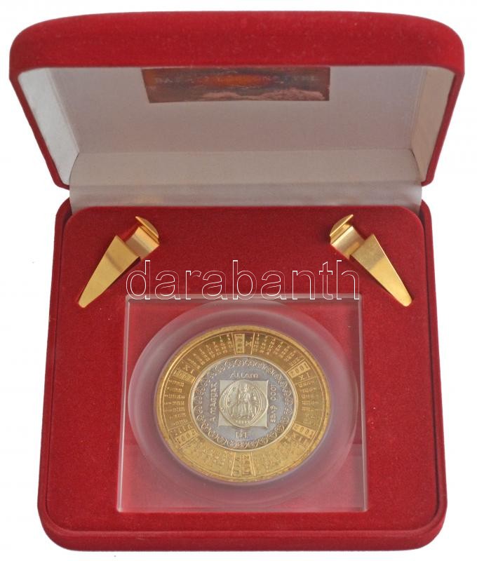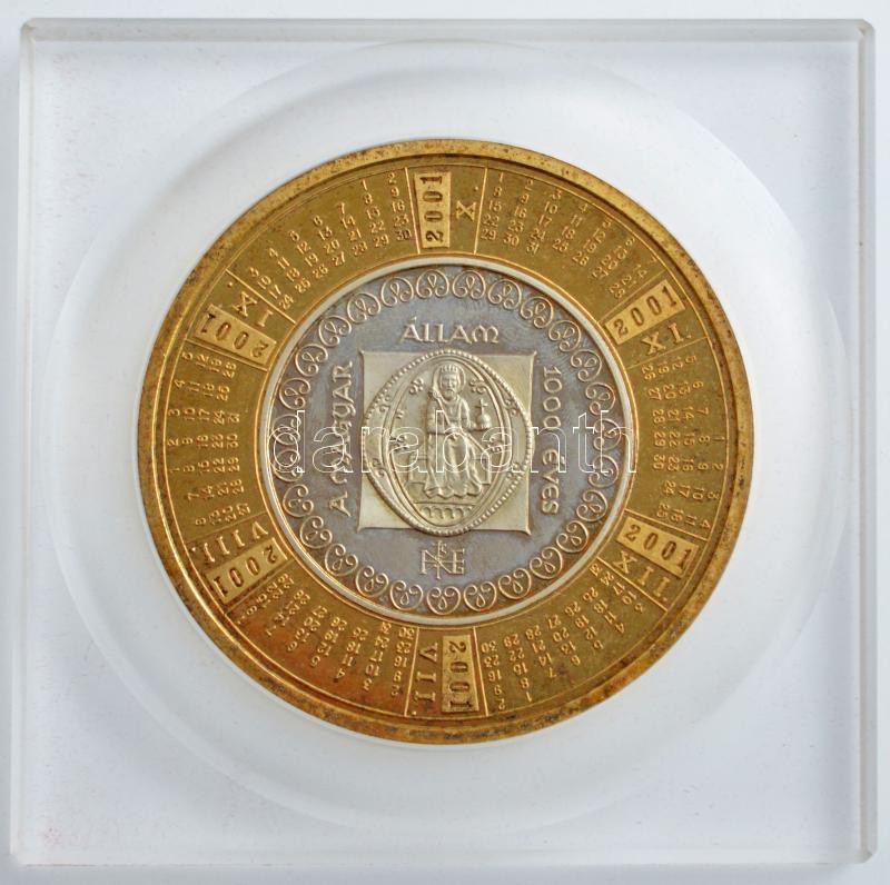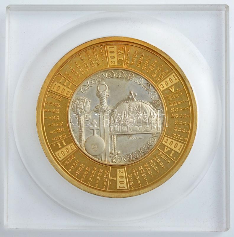 Description: Sülle Mária 2000. "A Magyar Állam 1000 éves" Ag emlékérem (~35g/0.925/42,5mm), körülötte aranyozott Br "2001 Naptár" érem dísztokban T:1- (PP) ujjlenyomat, patina