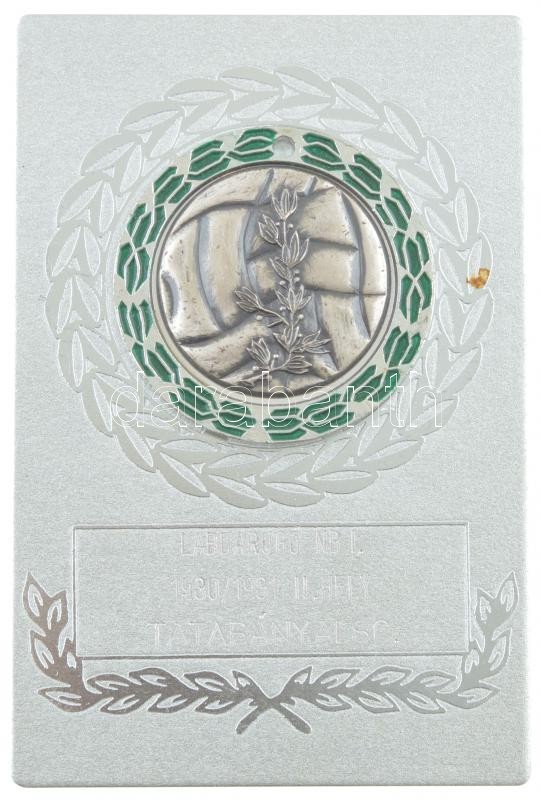 Description: 1981. "Labdarúgó NB I. 1980/1981. II. hely Tatabányai SC" feliratú, ezüstszínű fém plakett műbőr tokban, a TBSC címerét ábrázoló matricás lappal (66x100mm) T:1-,2