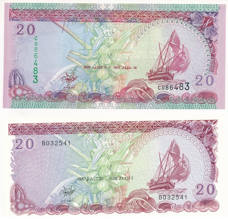 Maldives 1987. 20 Rufiyaa "B 032541" + 2000. 20 Rufiyaa "C 086483" C:UNC,AU