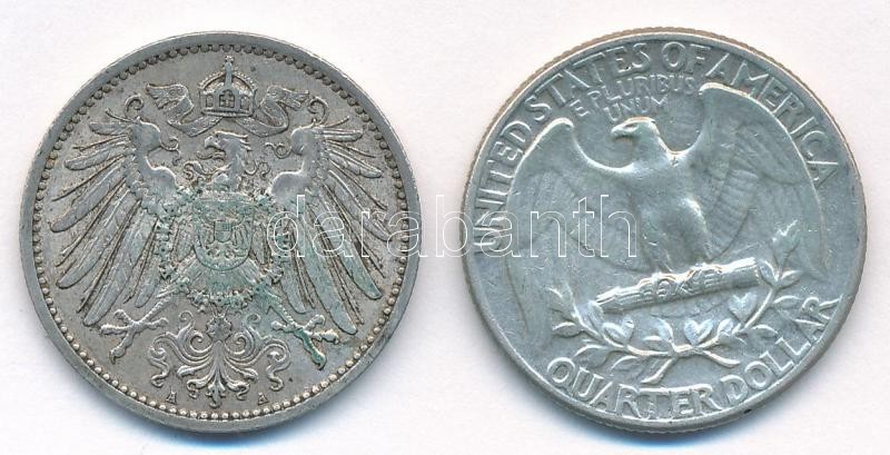 Description: Vegyes: Német Birodalom 1907A 1M Ag + Amerikai Egyesült Államok 1964. 1/4$ Ag "Washington" T:1-,2 kis patina Mixed: USA 1964. 1/4 Dollar Ag "Washington" + German Empire 1907A 1 Mark Ag C:AU,XF small patina Krause KM#14, KM#164