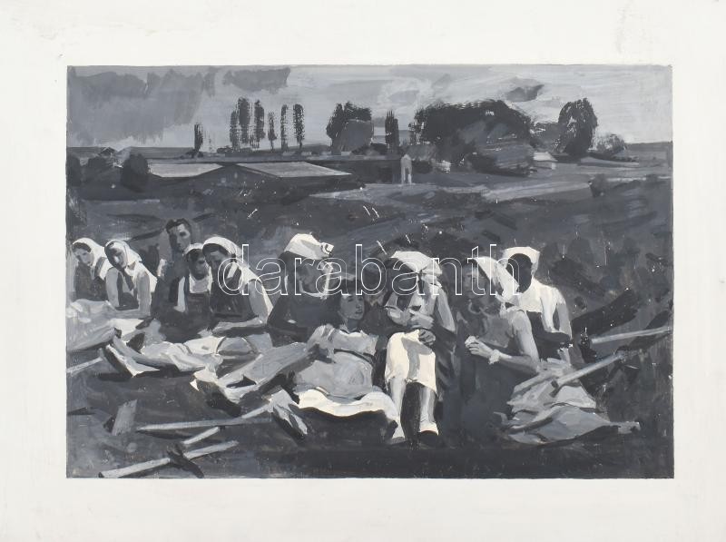 Jelzés nélkül: Pihenő (szocreál életkép). Olaj, farost. Apró felületi ...