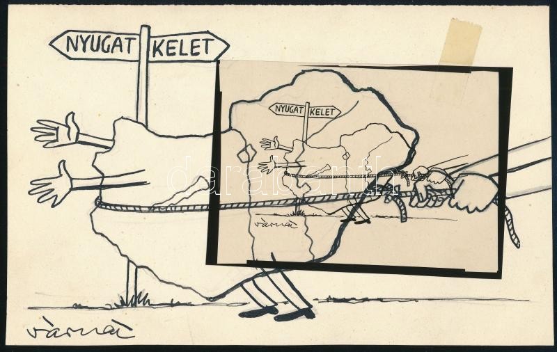 Description: Várnai György (1921-1991): 1956 - a megtorlás. Tus, papír, jelzett, hátoldalán feliratozott. Az Igazság c. lapban megjelent karikatúra. A laphoz ragasztva a karikatúra fóliára készült másolata. 13x20,5 cm.