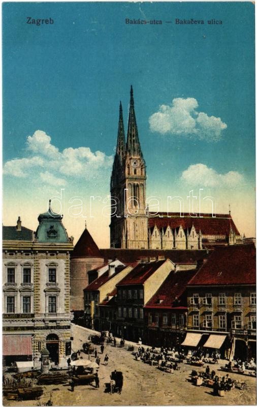 Description: Zagreb, Zágráb; Bakács utca, piac, Wasserthal, Josip B. Deutsch, Ferdo Krizman üzlete. Vasúti levelezőlapárusítás 21. 1915. / Bakaceva ulica / street, market, shops
