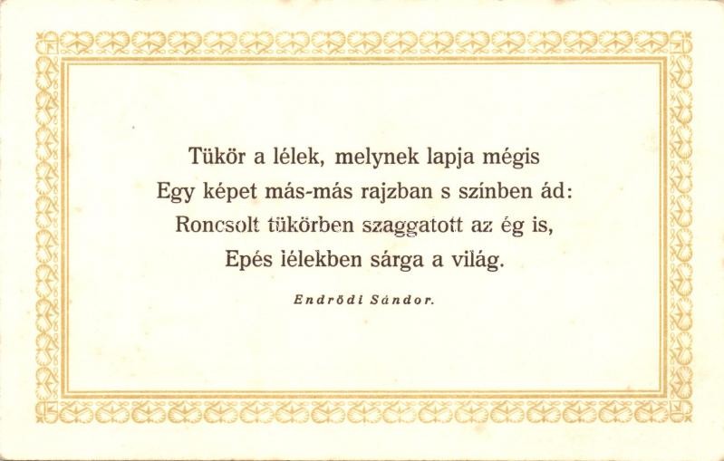 Description: Tükör a lélek, melynek lapja mégis egy képet más-más rajzban s színben ád: Roncsolt tükörben szaggatott az ég is, epés lélekben sárga a világ; Endrődi Sándor idézet; Kner Izidor / Quote from Endrődi Sándor (fl)
