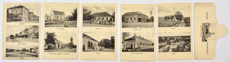 Füzesabony, izraelita templom, zsinagóga, fogyasztási szövetkezet üzlete, gyógyszertár, posta, Központi szálló, cséplés, vasútállomás - 6-részes képeslap (hajtásnál szétszakadt / bent til broken)