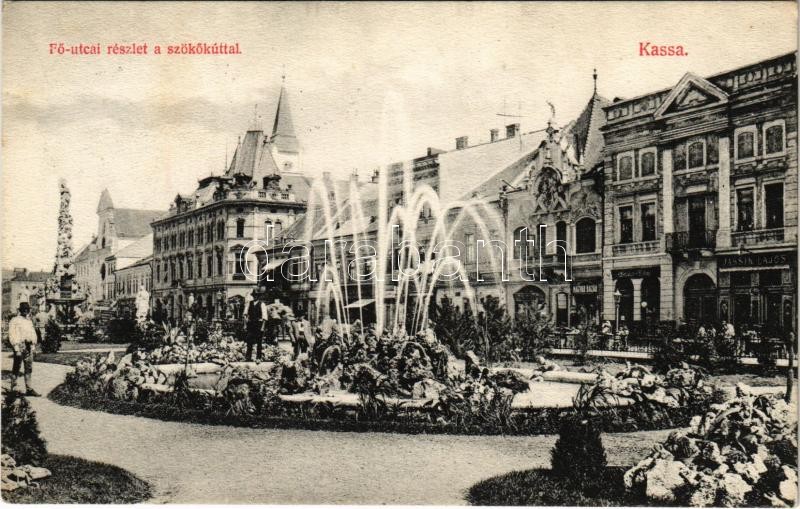 1908 Kassa, Kosice; Fő utca, szökőkút, Magyar Bazár, Breuer, Jassik La...