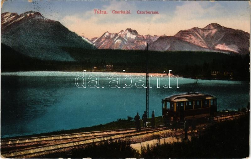 1913 Tátra, Magas-Tátra, Vysoké Tatry; Csorba-tó, villamos. Ed. Feitzi...