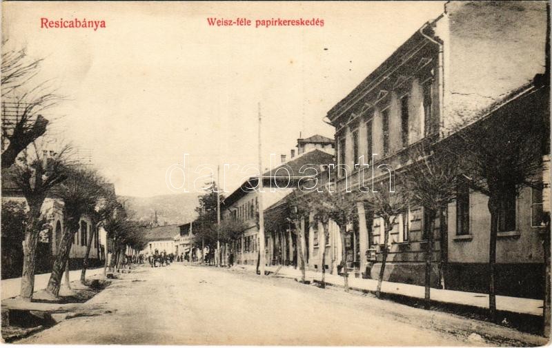 Resicabánya, Resicafalu, Resita; Weisz féle papírkereskedés / shop, street (EK)