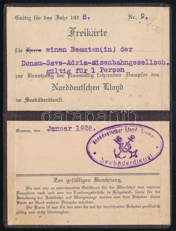 1928 Bremen (Bréma), a Norddeutscher Lloyd hajótársaság szabadjegye a ... https://www.darabanth.com/en/427-Online-auction/427.0/Art-and-other-collectibles/Documents~500019/1928-Bremen-Brema-a-Norddeutscher-Lloyd-hajotarsasag-szabadjegye-a-Donau-Save-Adria-Eisenbahn~II2729801