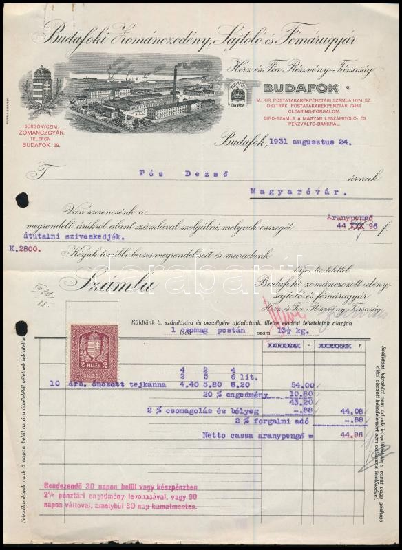 1931 Budafoki Zománcedény Sajtoló és Fémárugyár, Budafok Hesz és Fia Rt. fejléces számlája, okmánybélyeggel.