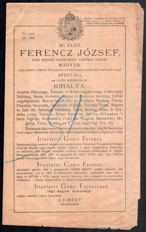 1909 Illyefalvi Gödri Ferenc járásbíró, 1848-as hadnagy részére szóló ... https://www.darabanth.com/en/427-Online-auction/427.0/Art-and-other-collectibles/Historical-documents-manuscripts~500020/1909-Illyefalvi-Godri-Ferenc-jarasbiro-1848-as-hadnagy-reszere-szolo-cimeres-level-kivC3~II2729976