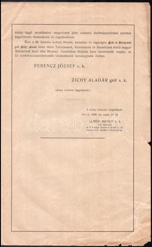 Description: 1909 Illyefalvi Gödri Ferenc járásbíró, 1848-as hadnagy részére szóló címeres levél (kiváltságlevél), az eredeti nyomtatott másolata, benne a címer ábrázolásával, 3 oldalon, kisebb sérülésekkel