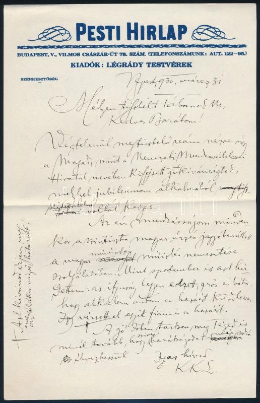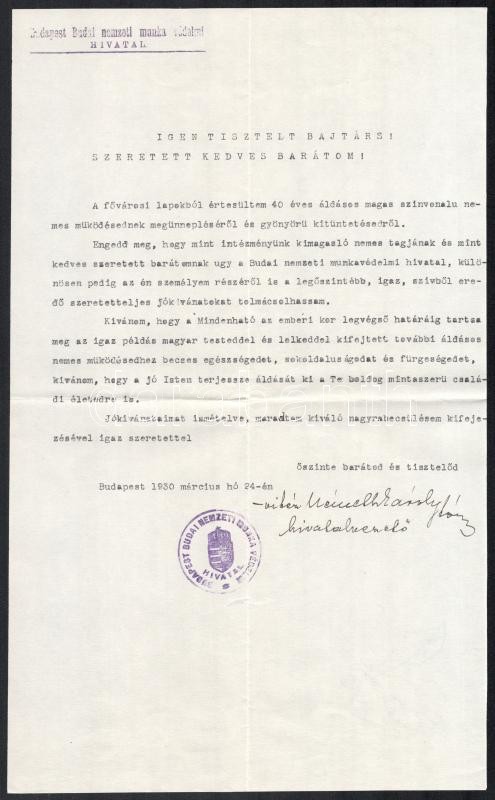 1930.III.24 vitéz Németh (Deisler) Károly ny. áll. tábornok, a Budapest Budai nemzeti munka védelmi hivatal vezetőjének (korábban a m. kir. 14. honvédgyalogezred parancsnoka, később A Légoltalmi Liga alakuló ülésekor a Liga vezetőségi tagja) gratuláló sorai Kézdi-Kovács László (1864-1942) festőművészhez, négy évtizedes művészi munkájának jubileuma alkalmából.. Egy géppel írt Budapest Budai nemzeti munka védelmi hivatal fejléces papíron pecséttel, Németh (Deisler) Károly autográf aláírásával, eredeti fejléces borítékban. A tételhez tartozik Kézdi-Kovács László (1864-1942) autográf köszönő válaszlevelének tervezete, egy kézzel írt oldal javításokkal.