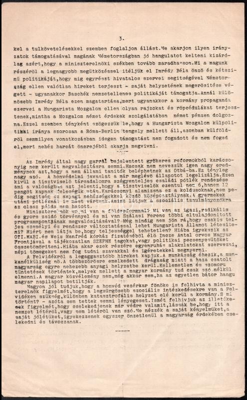 1938 Közérdekű levelek, a Magyarság c. hungarista politikai napilap az újság ideiglenes betiltásának idején kiadott propaganda körlevele, 4 gépelt oldal