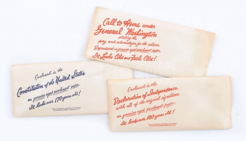 3 db amerikai történelmi dokumentum reprint: Az Egyesült Államok alkotmánya, függetlenségi nyilatkozat, függetlenségi háború toborzási hirdetmény. Eredeti borítékban. / 3 reproductions of American historical documents: U.S. Constitution, Declaration of Independence, Call to Arms under General Washington (Revolutionary War recruitment poster). In original envelopes.