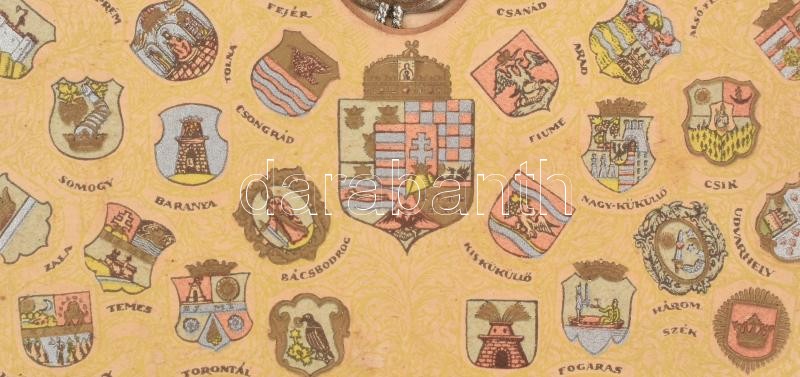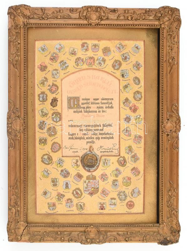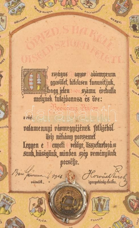 Description: cca 1920-1930 Az Országos Magyar Hadimúzeum Egyesület által kiadott, névre szóló "Nemzeti Ereklye" tanúsítvány, a történelmi Magyarország valamennyi vármegyéjének címerével és az összes vármegyéből származó földet tartalmazó ércbullával, keretben 23x15 cm.